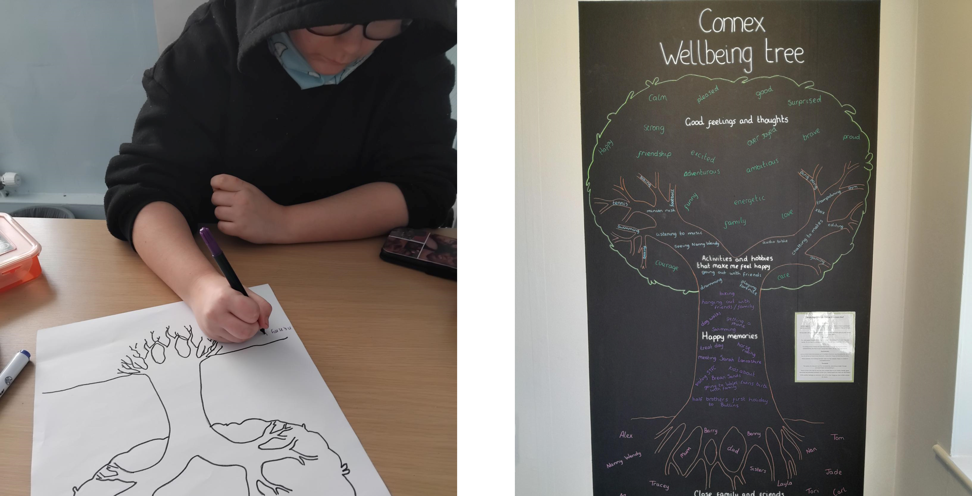 There has been a lovely new display created by the Pastoral team at Connex. During Mental Health week at Connex, the young people enjoyed completing a wellbeing tree. They started by thinking about their close friends and family who listen and support them. This is the core part of their wellbeing and support network which they wrote in the roots of the tree. They then went on to think about their happy memories, activities and hobbies that make them feel happy in the trunk and branches. This is their wellbeing tree growing. Finally they wrote about their good feelings and thoughts on the leaves as their tree bloomed.